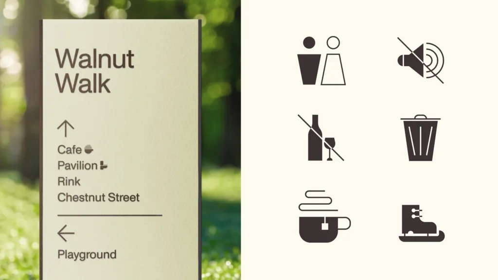 This wayfinding system integrates with the overall branding, ensuring that visitors can navigate the park easily while engaging with its visual identity. This practical aspect of the design makes the park accessible and welcoming, reinforcing its role as a community-centric space.